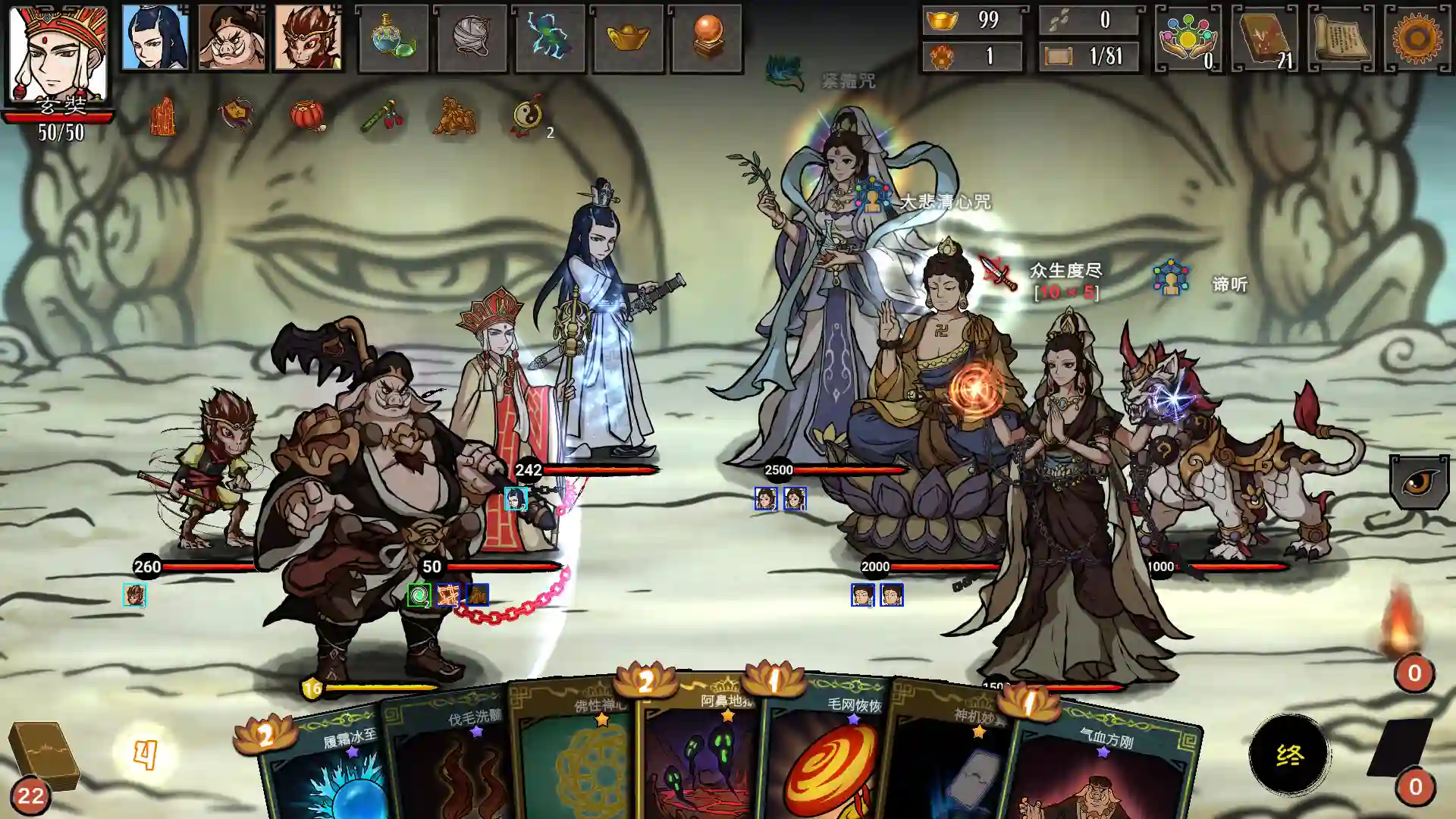 - 角色与团队:可选悟空、玄奘、白龙、八戒、沙僧 5 位英雄,各有独特技能、75 张专属卡池与剧情线;可招募 20 + 同伴组建最多 5 人小队,搭配无色卡与特殊卡牌解锁多元战术。