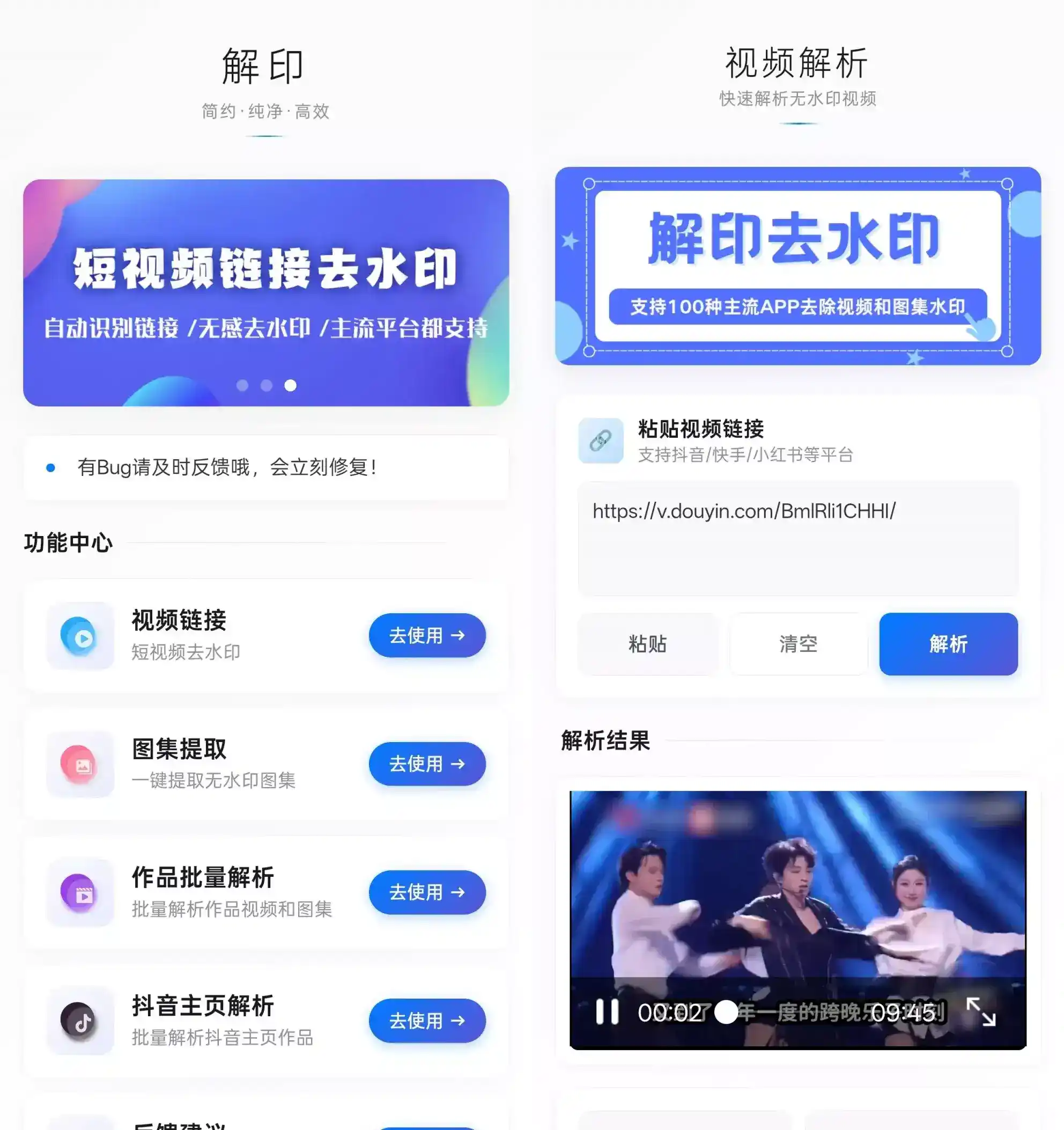 解印安卓版是一款专注短视频与图片去水印的解析工具,核心优势是全平台解析 + AI 去水印 + 批量处理 + 零门槛操作,适配抖音、快手、小红书、B 站等数十个主流短视频 / 图文平台,支持视频无水印解析下载与图集批量保存,兼容 Android 7.0+,无需复杂操作,一键即可获取高清无水印内容,是内容创作者、社交达人下载素材的高效工具。