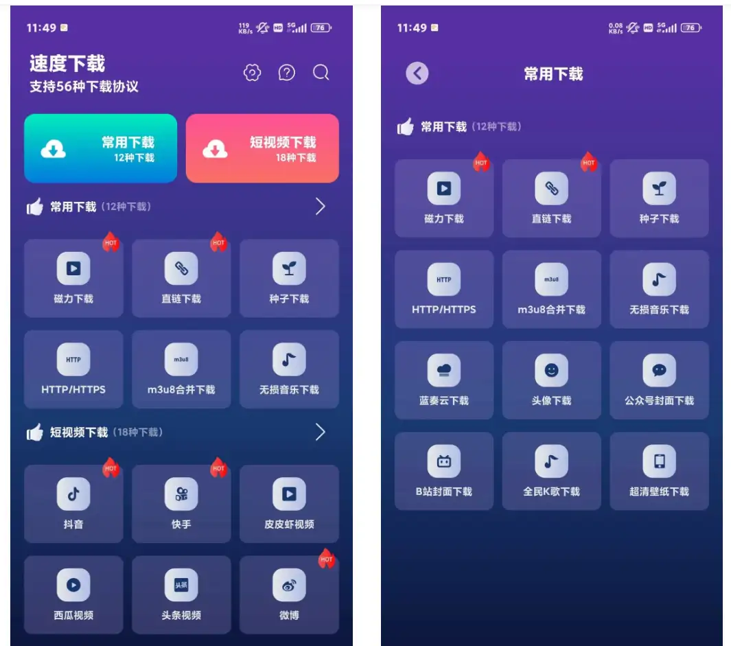 速度下载是安卓平台的聚合型资源下载工具,主打多协议下载、短视频无水印解析、网页资源嗅探,支持 56 种下载协议与 18 个短视频平台,以 “极速下载 + 边下边播 + 免注册无广告” 为核心优势,适配短视频保存、磁力 / 种子下载、无损音乐获取等场景。