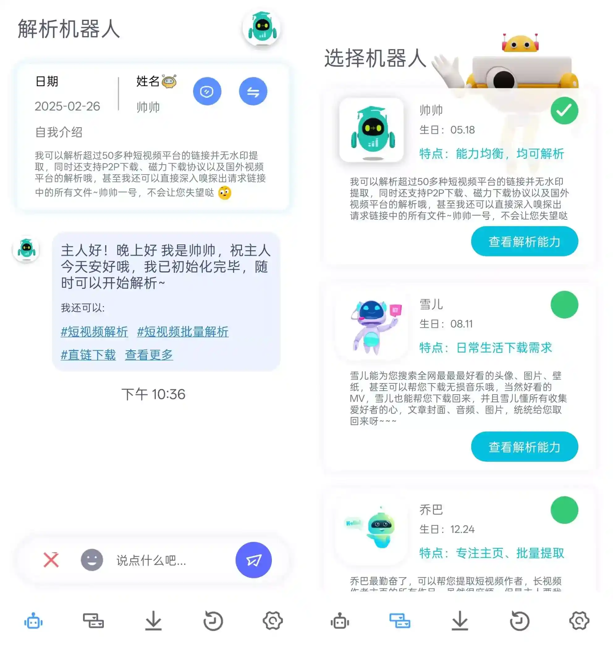 用户可以通过简单的操作选择不同的机器人助手,根据自己的需求进行视频解析和下载。软件提供了丰富的功能模块,满足用户多样化的需求。无论是短视频解析、音乐下载还是电商视频下载,解析机器人都能提供高效的服务。