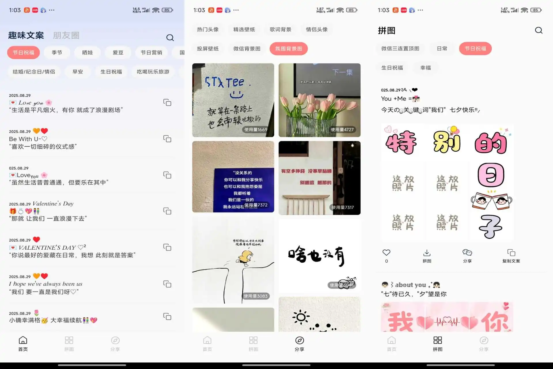 - 文案分类:早安 / 晚安、励志、伤感、搞笑、微商、节日(元旦 / 圣诞 / 七夕 / 中秋等)、美食、旅行、爱情、自拍、鸡汤、英文等,每日更新