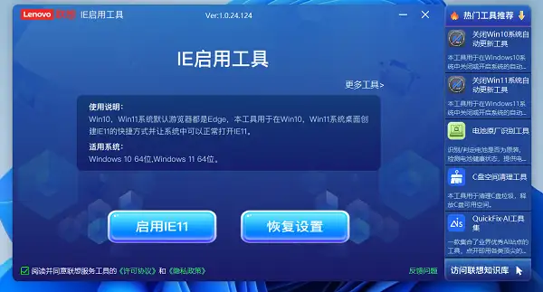 IE11启用工具 是由联想电脑出品的 Lenovo Quick Fix 其中之一工具,帮助我们启用系统自带的IE浏览器,win10,win11系统默认游览器都是Edge,该工具用于在Win10,win11系统桌面创建IE11的快捷方式并让系统中可以正常打开IE11浏览器。