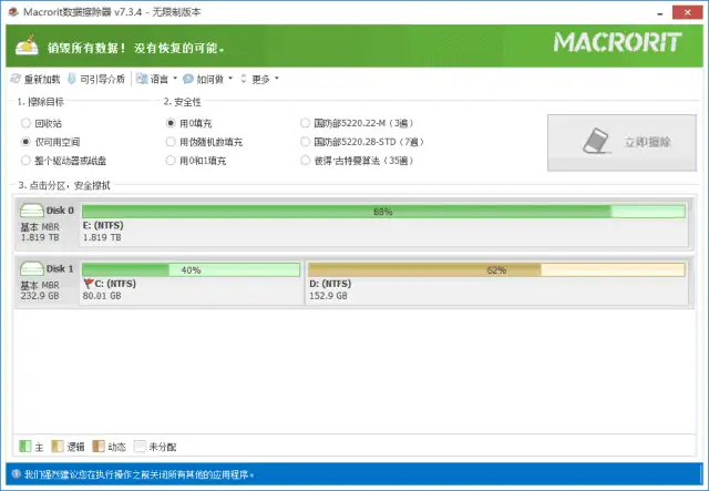 - Macrorit 专属算法:NTFS 优化,兼顾速度与安全,适合大容量硬盘。