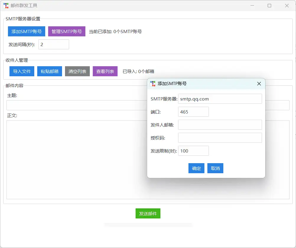 一个永久免费且无广告的邮件群发软件,直接使用SMTP来群发邮件支持添加多个发信邮箱,一个小而美的邮件群发软件。