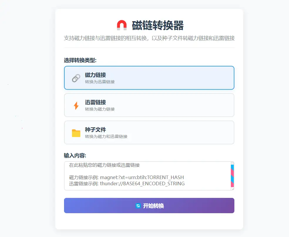 - 图标设计:每个转换选项都配有相应的图标(磁力链接图标、迅雷图标、文件图标)