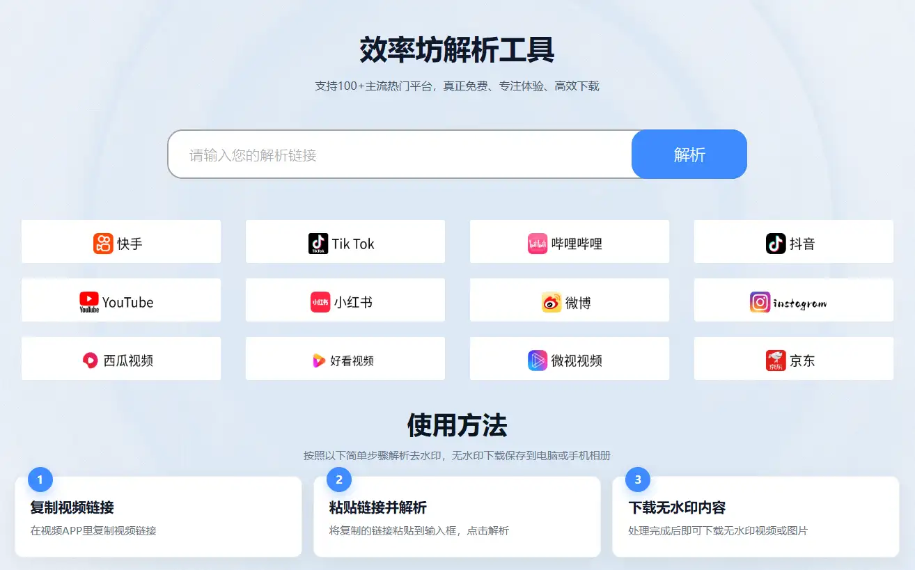 - 多平台全覆盖:兼容抖音、快手、微博、小红书、TikTok、YouTube 等 100 + 主流视频及图片平台。
